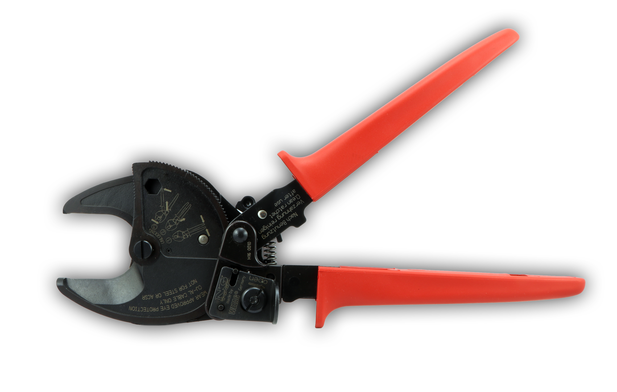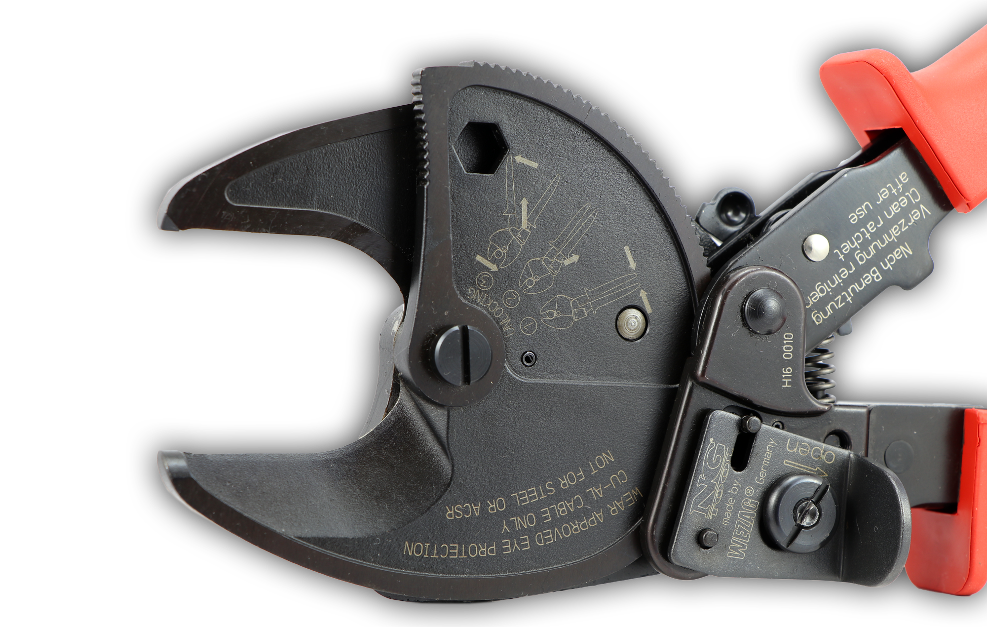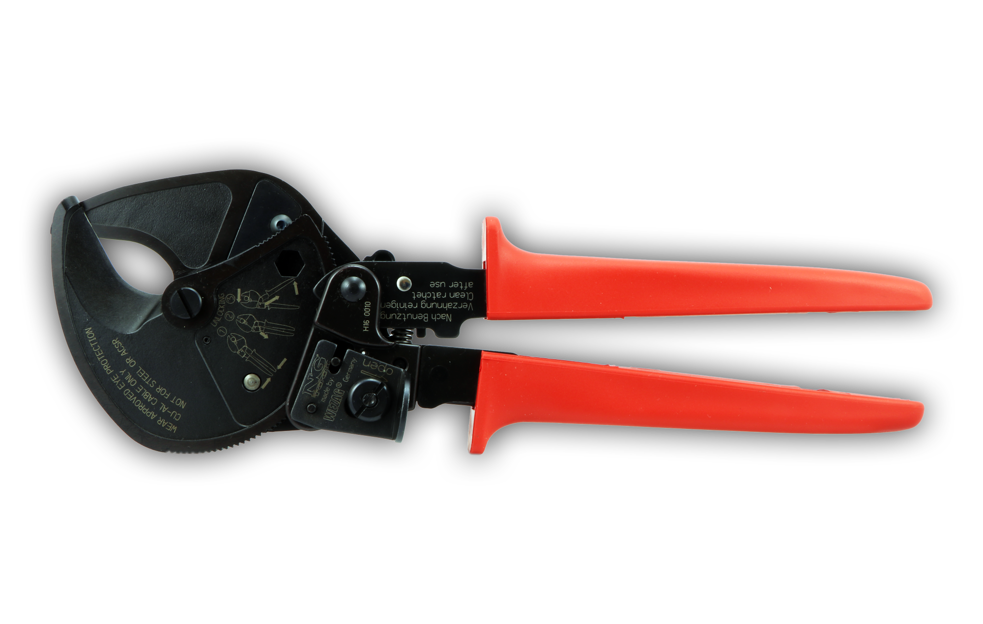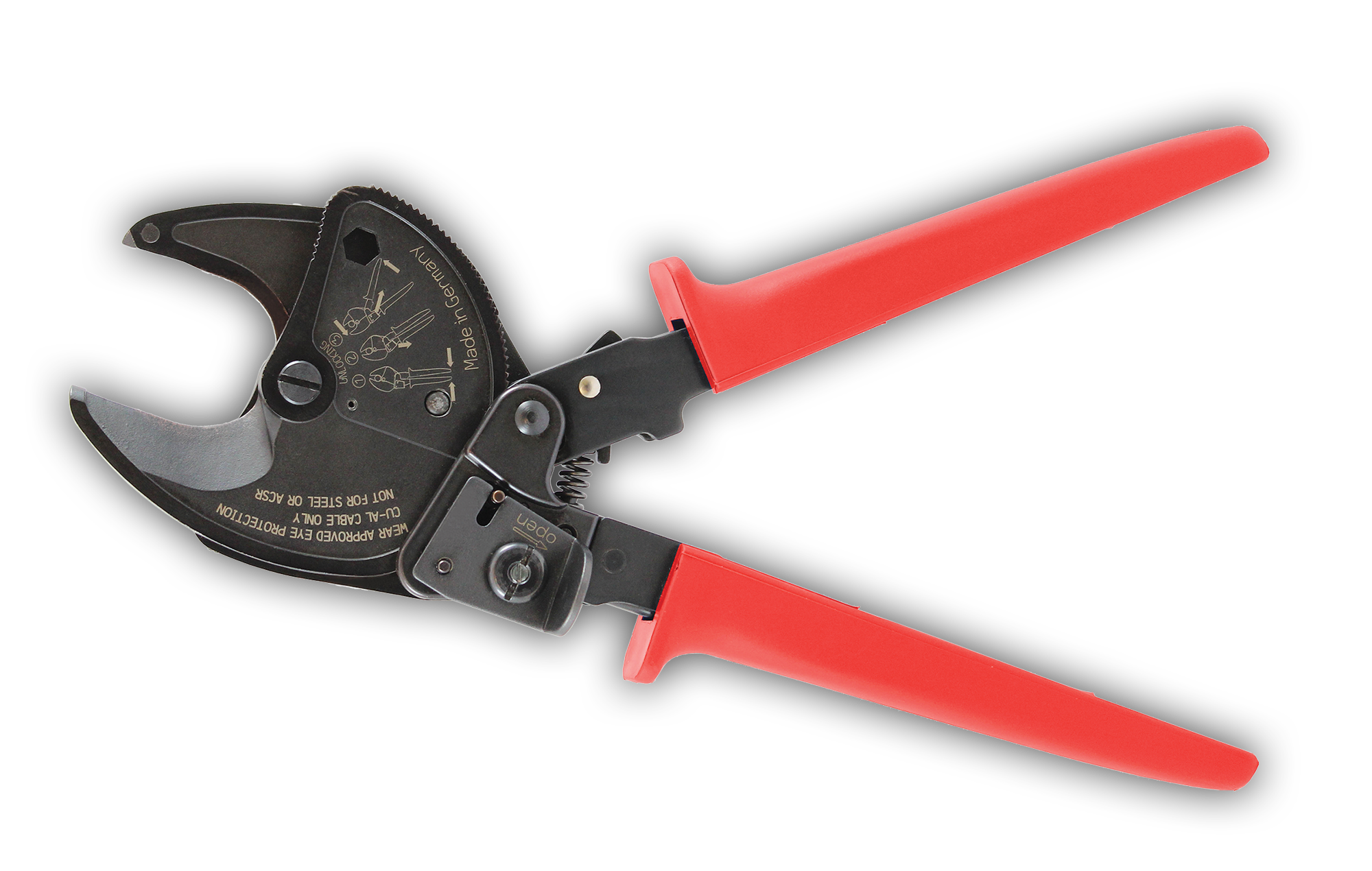 Kabelový řezák vybavený blokovací pákou a optimalizovaným, odjišťovacím mechanismem.